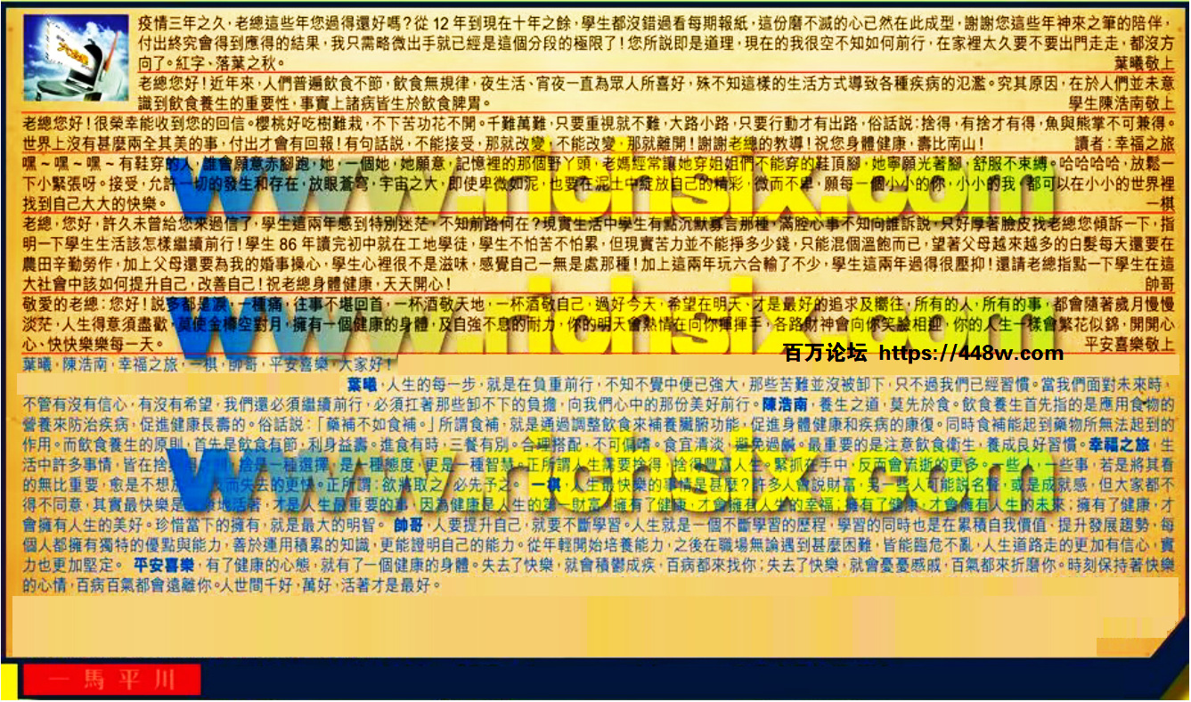 【1】.疫情三年之久,老總這些年您過得還好嗎?從 12 年到現在十年之餘,學生都沒錯過看每期報紙,這份磨不滅的心已然在此成型,謝謝您這些年神來之筆的陪伴,付出終究會得到應得的结果,我只需略微出手就已經是這個分段的極限了!您所說即是道理,現在的我很空不知如何前行,在家裡太久要不要出門走走,都沒方向了。紅字、落葉之秋。 葉曦敬上