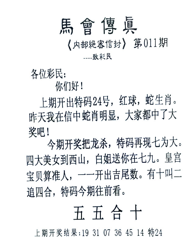 011期:首发推荐:≮馬會傳眞≯→(香港正版)