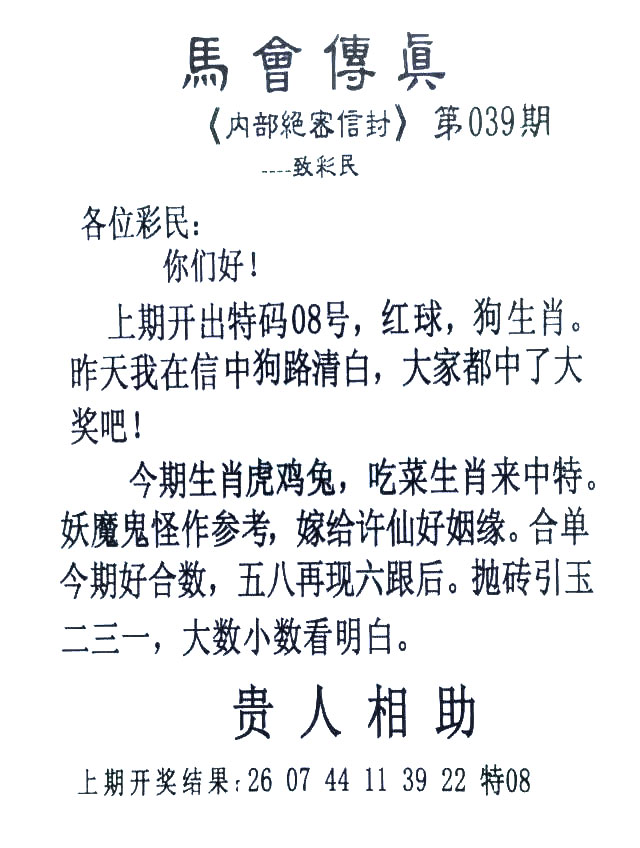 039期:首发推荐:≮馬會傳眞≯→(香港正版)