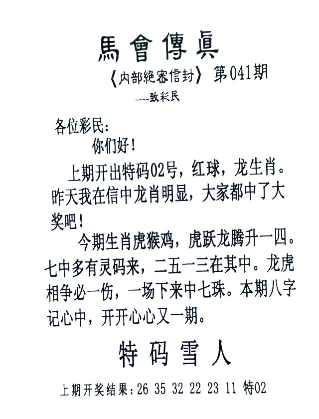 041期:首发推荐:≮馬會傳眞≯→(香港正版)